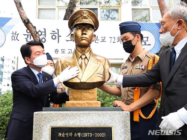 [인천=뉴시스] 김동영 기자 = 국민의힘 안철수 의원(왼쪽)이 29일 오후 인천 연수구 송도고등학교에서 열린 제20주기 故 윤영하 소령 추모식에서 윤 소령 흉상의 빗물을 닦고 있다. 2022.06.29. dy0121@newsis.com