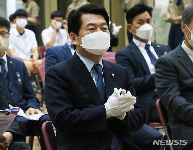 [인천=뉴시스] 김동영 기자 = 국민의힘 안철수 의원이 29일 오후 인천 연수구 송도고등학교에서 열린 제20주기 故 윤영하 소령 추모식에 참석해 추모사를 듣고 있다. 2022.06.29. dy0121@newsis.com