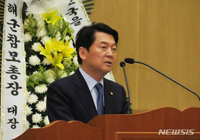 [인천=뉴시스] 김동영 기자 = 국민의힘 안철수 의원이 29일 오후 인천 연수구 송도고등학교에서 열린 제20주기 故 윤영하 소령 추모식에서 추모사를 하고 있다. 2022.06.29. dy0121@newsis.com