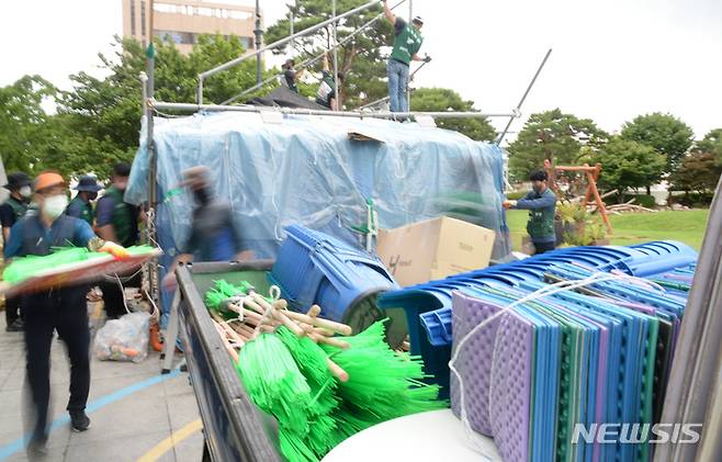 [전주=뉴시스] 김얼 기자 = 전북 전주시 전주시청 앞 천막농성장이 447일 만에 철거가 확정된 29일 민주노총 전국민주연합노동조합 관계자들이 분주하게 움직이며 농성장을 해체하고 있다. 2022.06.29. pmkeul@newsis.com