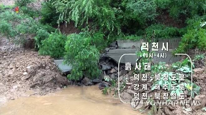(서울=연합뉴스) 북한 평안남도 북부 대동강 상류 유역에 있는 덕천시에서 오늘 0시부터 4시까지 지속적으로 내린 비로 덕천-북창 사이 도로 40m 구간에서 200입방미터의 흙사태가, 강계-해주 사이 도로 60m 구간과 덕천-북창선 철도 10m 구간에서 흙사태가 발생했다고 조선중앙TV가 29일 보도했다. [조선중앙TV 화면] 2022.6.29