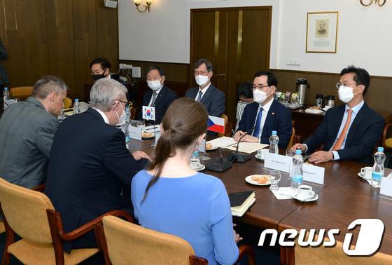 (서울=뉴스1) = 이창양 산업통상자원부 장관이 29일 체코 프라하 하원의사당에서 카렐 하블리첵 하원 부의장과 면담하고 있다. (산업통상자원부 제공) 2022.6.29/뉴스1