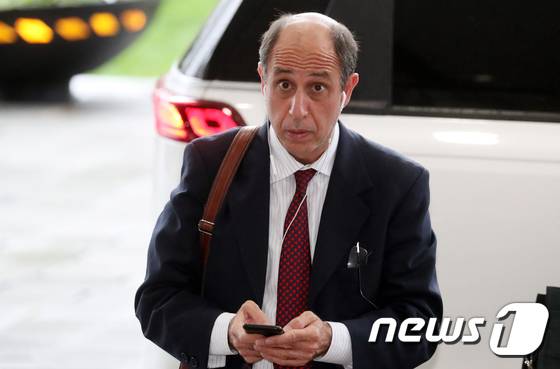 (서울=뉴스1) 김명섭 기자 = 토마스 오헤아 킨타나 유엔 북한인권특별보고관이 29일 오후 서울 종로구 세종대로 정부서울청사로 권영세 통일부 장관과 김기웅 통일부 차관을 접견을 하기 위해 도착하고 있다. 2022.6.29/뉴스1