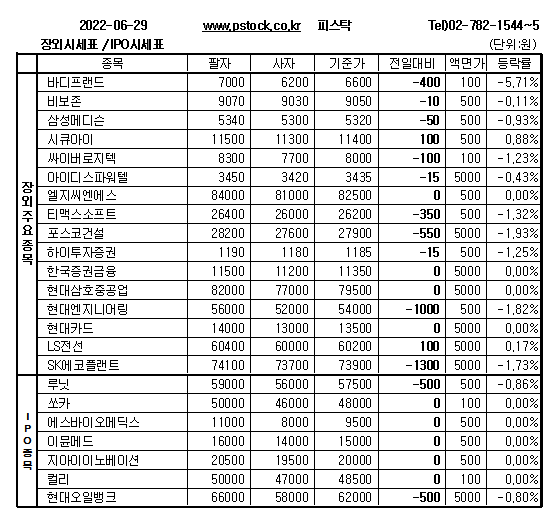 쏘카(48000원), 에스바이오메딕스(9500원), 이뮨메드(1만5000원), 엘지씨엔에스(82500원), 한국증권금융(1만1350원), 케이뱅크(1만4700원), 메디오젠(1만5000원), 솔젠트(7500원), 노바셀테크놀로지(4250원) 등 장외종목은 주가변동없이 장을 마감했다.