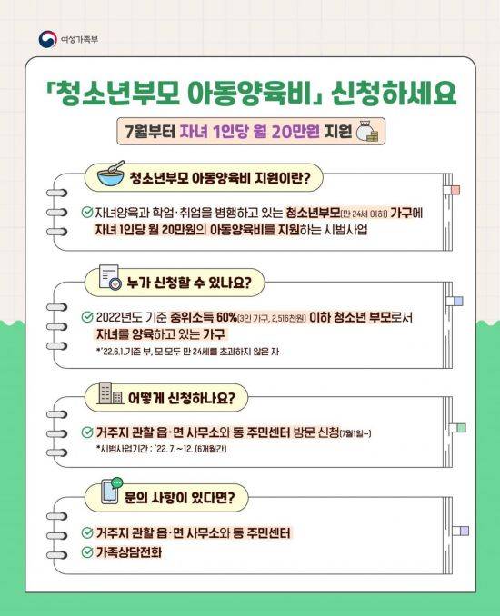 지원을 희망하는 청소년 부모는 7월부터 신분증을 가지고 거주지 행정복지센터에 신청하면 된다.