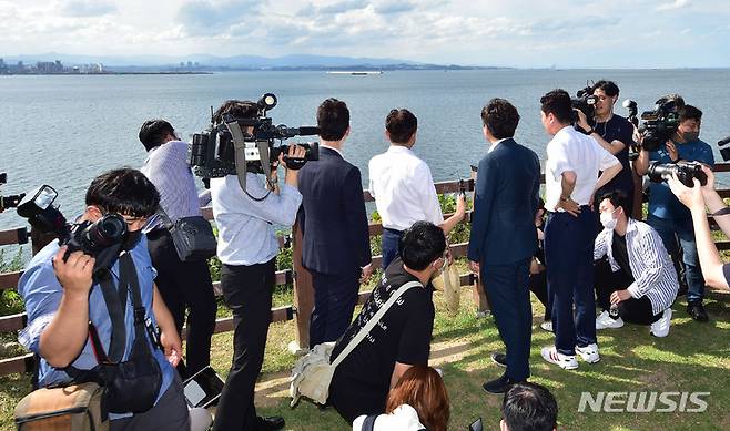 [포항=뉴시스] 이무열 기자 = 이준석 국민의힘 대표가 29일 오후 경북 포항시 남구 동해면 연오랑세오녀 테마공원에서 포항시 관계자에게 영일만 대교 사업 추진 경과에 대해 설명을 듣고 있다. 2022.06.29. lmy@newsis.com