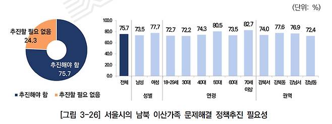 보고서는 “남북 이산가족 문제해결은 서울시민에 직접적으로 영향을 미치는 대표적인 통일·평화 정책”이라며 “남북 이산가족 생존자의 고령화와 높은 사망률은 서울시의 남북 이산가족 정책의 시급한 추진을 요구한다”고 밝혔다.