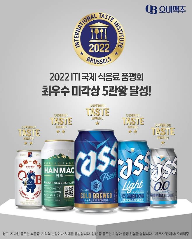 오비맥주는 29일 '카스 프레시', '카스 라이트', '카스 0.0', '한맥', '오비라거' 등 5개 브랜드가 '국제식음료품평원(International Taste Institute, ITI)'이 주최한 '2022 iTi 국제식음료품평회'에서 각각 '국제 우수 미각상(Superior Taste Award)'을 수상했다고 밝혔다.