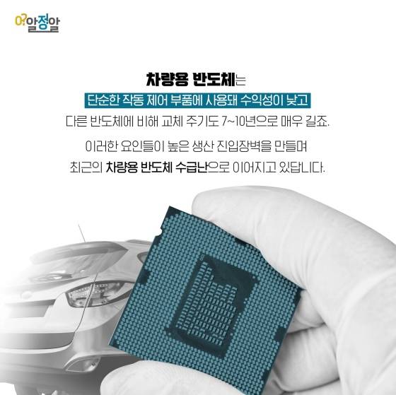 차량용 반도체는 단순한 작동 제어 부품에 사용돼 수익성이 낮고 다른 반도체에 비해 교체 주기도 7~10년으로 매우 길죠. 이러한 요인들이 높은 생산 진입장벽을 만들며, 최근의 차량용 반도체 수급난으로 이어지고 있답니다.