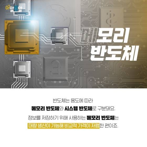 정보를 저장하기 위해 사용하는 메모리 반도체는 대량생산이 가능해 비교적 가격이 저렴한 편이죠.