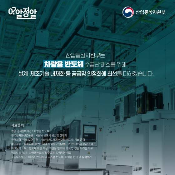 산업통상자원부는 차량용 반도체 수급난 해소를 위해 '설계·제조기술 내재화 등 공급망 안정화에 최선을 다하겠습니다.