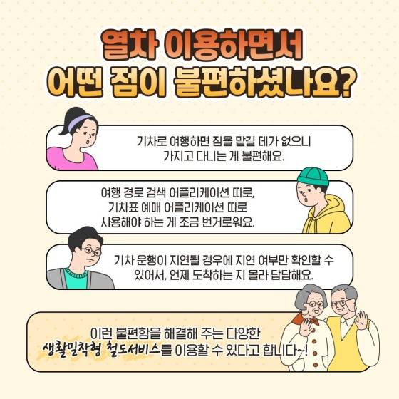 열차 이용하면서 어떤 점이 불편하셨나요? '기차로 여행하면 짐을 맡길 데가 없으니 가지고 다니는 게 불편해요.' '여행 경로 검색 애플리케이션 따로, 기차표 예매 애플리케이션 따로 사용해야 하는 게 조금 번거로워요.' '기차 운행이 지연될 경우에 지연 여부만 확인할 수 있어서, 언제 도착하는지 몰라 답답해요.' 이런 불편함을 해결해 주는 다양한 '생활 밀착형 철도 서비스'를 이용할 수 있다고 합니다.