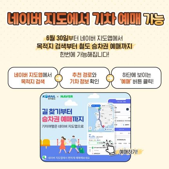 6월 30일부터 네이버 지도 앱에서 목적지 검색부터 철도 승차권 예매까지 한 번에 가능해집니다!