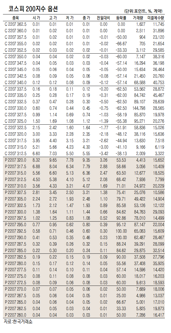 [표]코스피200지수 옵션 시세(6월 29일)