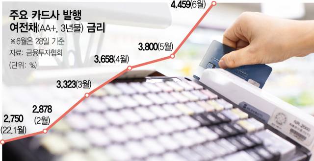 29일 금융투자협회에 따르면 주요 카드사가 발행하는 신용등급 AA+ 여신전문금융회사채 3년물 금리는 전날 4.459%를 기록했다. 지난해 말 기준금리 인상이 본격적으로 시작되면서 AA+ 여전채 3년물 금리는 가파른 상승세를 이어가고 있다. 이달 들어 10년 만에 여전채 3년물 금리가 4%를 돌파하는 등 올 들어서만 2%포인트 넘게 뛰었다.