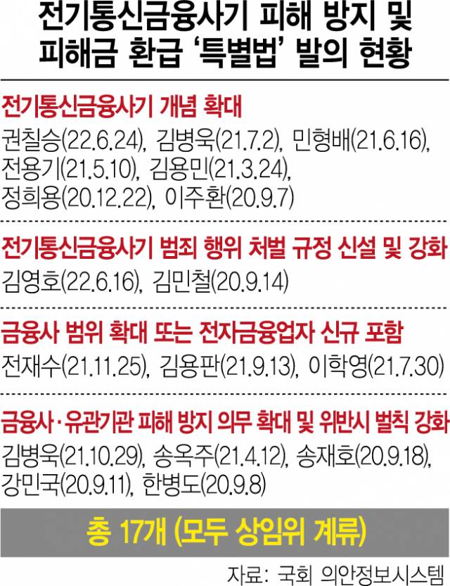 29일 국회 의안정보시스템에 따르면 21대 국회에서 발의된 ‘전기통신금융사기 피해 방지 및 피해금 환급에 관한 특별법(이하 특별법)’ 일부 개정 법률안은 총 17개나 된다. 2020년 9월 초부터 꾸준히 법 개정 목소리가 나온 가운데 특별법 개정안은 이달 16일과 24일에도 두 건이나 발의됐다.