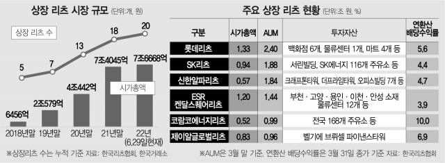29일 한국거래소에 따르면 국내 상장 리츠 20개의 시가총액 규모는 7조 6668억 원에 달한다. 2020년 말(4조 442억 원) 이후 1년 반 만에 몸집이 2배 가까이 불어났다. 견조한 투자 수요 속에서 증시에 데뷔하는 리츠가 늘어나고 기존 리츠들도 새로운 부동산 자산을 편입하며 규모를 키우고 있기 때문이다.