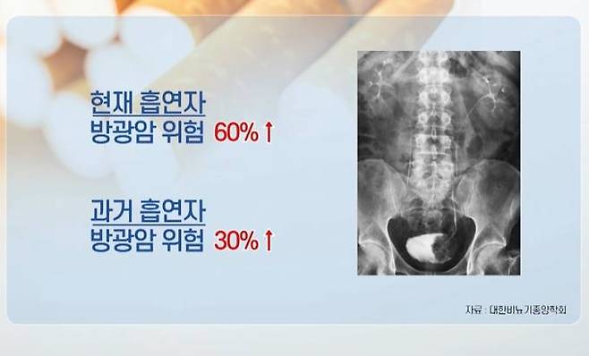 대한비뇨기종양학회의 '방광암 발생 현황' 자료에 따르면, 비흡연자 대비 흡연자의 방광암 위험이 60% 높았습니다.