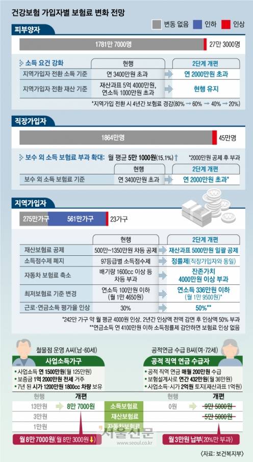 그동안 자영업자와 일용직 등 건강보험 지역가입자는 소득뿐만 아니라 재산과 자동차에도 보험료가 부과돼 형평성 논란이 끊이지 않았다. 9월부터 적용되는 건강보험 2단계 개편은 부과기준을 단순화하면서도 형평성을 강화한 게 핵심이다. 보험료를 지불할 능력이 있으면서도 피부양자로 무임승차하던 27만 3000명은 지역가입자로 전환해 공정성을 높였다.