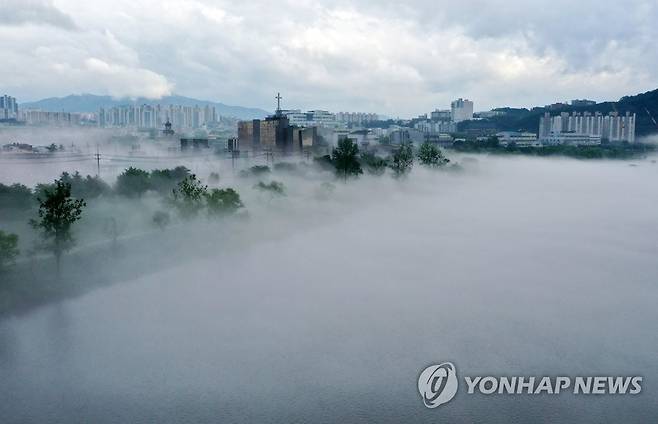 (춘천=연합뉴스) 양지웅 기자 = 전국 곳곳에서 장맛비가 이어지는 29일 오후 강원 춘천시 소양강 위로 물안개가 짙게 피어오르고 있다. 2022.6.29