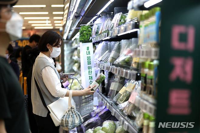 [서울=뉴시스] 백동현 기자 = 29일 오후 서울 시내 한 대형마트에서 직장인 김모 씨가 장을 보고 있다. 연일 계속되는 고물가 상황에 부담을 느낀 김모 씨는 약 한 달 전부터 도시락을 준비해 직장에서 점심을 해결하기 시작했다. 2022.06.29. livertrent@newsis.com