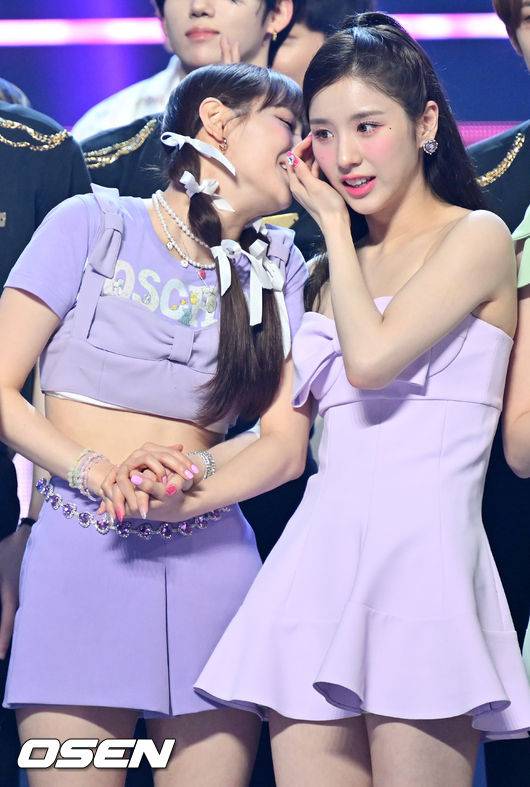 이달의 소녀 (LOONA) 츄와 희진이 1위 발표를 기다리며 귓속말을 하고 있다. 2022.06.29 /rumi@osen.co.kr