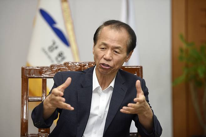 [춘천=뉴시스] 김경목 기자 = 최문순 강원도지사가 퇴임을 하루 앞둔 29일 오전 강원 춘천시 강원도청 집무실과 붙어 있는 접견실에서 뉴시스와 인터뷰를 하고 있다. 최 지사는 2011년 4·27 보궐선거에서 당선 후 3선 연임에 성공했다. 최 지사는 "저희들도 쇼킹했죠. 원주가 우리 당의 기반인데 거기서 전패를 하다시피했으니까요"라며 "서울의 영향이 아주 안 좋게 영향을 미쳤죠"라고 분석했다. (사진=강재훈 사진가 제공) 2022.06.29. photo@newsis.com
