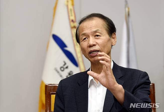 [춘천=뉴시스] 김경목 기자 = 최문순 강원도지사가 퇴임을 하루 앞둔 29일 오전 강원 춘천시 강원도청 집무실과 붙어 있는 접견실에서 뉴시스와 인터뷰를 하고 있다. 최 지사는 2011년 4·27 보궐선거에서 당선 후 3선 연임에 성공했다. 최 지사는 '권성동 원내대표에게 대권 도전의 자격이 있느냐'라는 질문에 "당연히 있겠죠"라고 답했다. (사진=강재훈 사진가 제공) 2022.06.29. photo@newsis.com