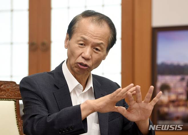 [춘천=뉴시스] 김경목 기자 = 최문순 강원도지사가 퇴임을 하루 앞둔 29일 오전 강원 춘천시 강원도청 집무실과 붙어 있는 접견실에서 뉴시스와 인터뷰를 하고 있다. 최 지사는 2011년 4·27 보궐선거에서 당선 후 3선 연임에 성공했다. 최 지사는 6·1 지방선거 민주당 참패 원인에 대해 "이명박 박근혜가 등장할 때 이미 민주당에 대한 겨고가 내려졌다"라고 진단했다. (사진=강재훈 사진가 제공) 2022.06.29. photo@newsis.com
