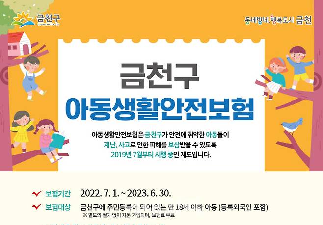 아동생활안전보험은 금천구가 안전에 취약한 아동들이 재난이나 사고로 인한 피해를 보상받을 수 있도록 2019년 7월부터 시행 중인 제도다.