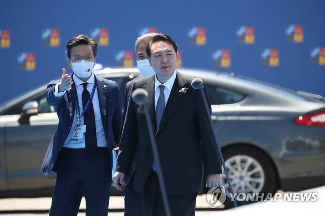 (마드리드=연합뉴스) 안정원 기자 = 윤석열 대통령이 29일(현지시간) 스페인 마드리드 이페마 컨벤션센터에서 열린 북대서양조약기구(NATO·나토) 정상회의 참석을 위해 회의장에 도착하고 있다. 2022.6.29 [대통령통신사진기자단]