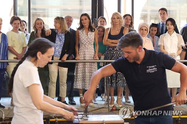 (마드리드=연합뉴스) 윤석열 대통령의 북대서양조약기구(NATO.나토) 정상회의 참석에 동행한 김건희 여사가 29일(현지시간) 스페인 마드리드에서 정상 배우자들과 왕립유리공장을 견학하고 있다. 2022.6.29 [스페인 왕실 트위터 캡처. 재판매 및 DB 금지]