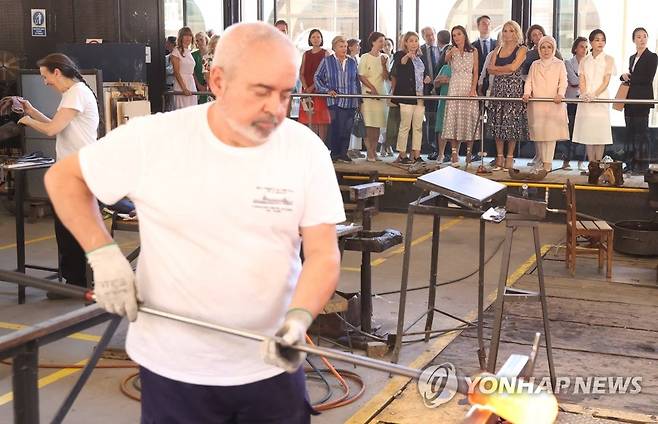 (마드리드=연합뉴스) 윤석열 대통령의 북대서양조약기구(NATO.나토) 정상회의 참석에 동행한 김건희 여사가 29일(현지시간) 스페인 마드리드에서 정상 배우자들과 왕립유리공장을 견학하고 있다. 2022.6.29 [스페인 왕실 트위터 캡처. 재판매 및 DB 금지]