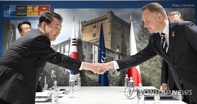 (마드리드=연합뉴스) 안정원 기자 = 북대서양조약기구((NATO·나토) 정상회의 참석을 위해 스페인을 방문 중인 윤석열 대통령이 29일(현지시간) 마드리드 이페마 컨벤션센터에서 열린 한-폴란드 정상회담에서 안제이 두다 폴란드 대통령과 인사하고 있다. 2022.6.29