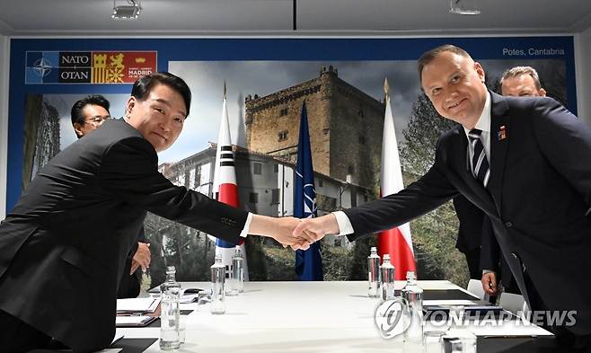 (마드리드=연합뉴스) 안정원 기자 = 북대서양조약기구((NATO·나토) 정상회의 참석을 위해 스페인을 방문 중인 윤석열 대통령이 29일(현지시간) 마드리드 이페마 컨벤션센터에서 열린 한-폴란드 정상회담에서 안제이 두다 폴란드 대통령과 인사하고 있다. 2022.6.29