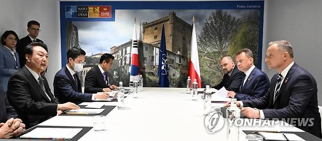 (마드리드=연합뉴스) 안정원 기자 = 북대서양조약기구((NATO·나토) 정상회의 참석을 위해 스페인을 방문 중인 윤석열 대통령이 29일(현지시간) 마드리드 이페마 컨벤션센터에서 한-폴란드 정상회담을 하고 있다. 2022.6.29