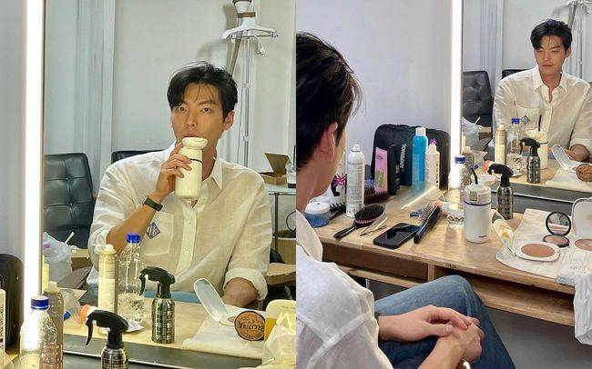 공개된 사진은 메이크업을 받기 위해 화장대 앞에 앉아있는 김우빈의 모습.
