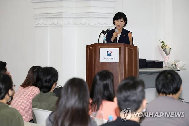 (서울=연합뉴스) 전현희 국민권익위원장이 29일 서울시청 시민청에서 열린 2030 청렴인재 아카데미 수료식에 참석해 인사말을 하고 있다. 2022.6.29