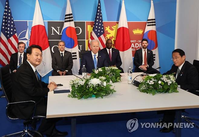 (마드리드=연합뉴스) 서명곤 기자 = 윤석열 대통령이 29일 스페인 마드리드 이페마(IFEMA) 컨벤션센터에서 열린 한미일 정상회담에서 조 바이든 미국 대통령, 기시다 후미오 일본 총리와 대화하고 있다. 2022.6.29