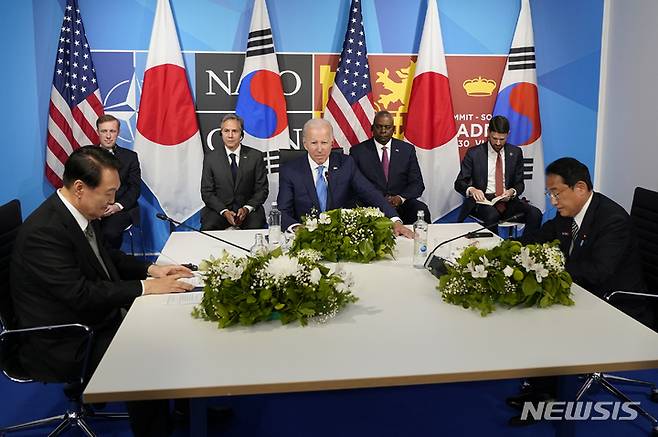[마드리드=AP/뉴시스] 윤석열 대통령이 29일(현지시간) 마드리드 이페마(IFEMA)에서 조 바이든 미국 대통령, 기시다 후미오 일본 총리와 한미일 정상회담을 하고 있다.2022.06.29.