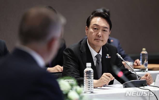 [마드리드=뉴시스] 전신 기자 = 윤석열 대통령이 29일(현지시간) 마드리드 매리어트 페리아 호텔에서 아태 파트너 4개국(한·일·호주·뉴질랜드) 정상 회동을 하고 있다. (사진=대통령실 제공) 2022.06.29. photo@newsis.com
