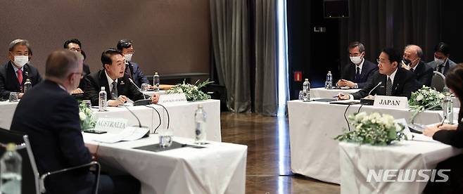 [마드리드=뉴시스] 전신 기자 = 윤석열 대통령이 29일(현지시간) 마드리드 매리어트 페리아 호텔에서 아태 파트너 4개국(한·일·호주·뉴질랜드) 정상 회동을 하고 있다. 왼쪽부터 앤서니 노먼 알바니지 호주 총리, 윤 대통령, 기시다 후미오 일본 총리. (사진=대통령실 제공) 2022.06.29. photo@newsis.com