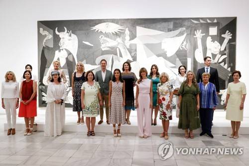 epa10041024 Spanish Queen Letizia (C-L) and the wife of Spanish Prime Minister, Begona Gomez (C-R), pose for a group photo with First Ladies and partners of the Heads of State and Government of NATO's member countries in front of Pablo Picasso's artwork 'Guernica' during their visit to the Queen Sofia National Museum in Madrid, Spain, 29 June 2022, on the sidelines of the NATO Summit. EPA/BALLESTEROS / POOL