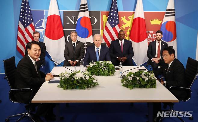 [마드리드=뉴시스] 전신 기자 = 윤석열 대통령이 29일(현지시간) 마드리드 이페마(IFEMA)에서 조 바이든 미국 대통령, 기시다 후미오 일본 총리와 한미일 정상회담을 하고 있다. 2022.06.29. photo1006@newsis.com