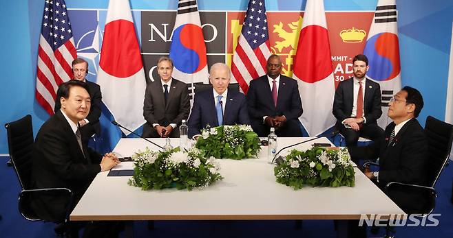 [마드리드=뉴시스] 전신 기자 = 윤석열 대통령이 29일(현지시간) 마드리드 이페마(IFEMA)에서 조 바이든 미국 대통령, 기시다 후미오 일본 총리와 한미일 정상회담을 하고 있다. 2022.06.29. photo1006@newsis.com