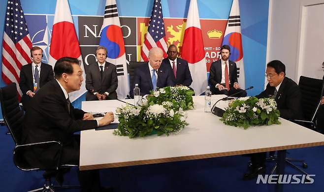 [마드리드=뉴시스] 윤석열 대통령이 29일(현지시간) 마드리드 이페마(IFEMA)에서 조 바이든 미국 대통령, 기시다 후미오 일본 총리와 한미일 정상회담을 하고 있다. 2022.06.29. photo1006@newsis.com