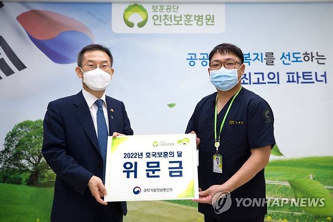 (서울=연합뉴스) 이종호 과학기술정보통신부 장관(왼쪽)이 29일 오후 인천광역시 미추홀구 인천보훈병원을 방문해 오정우 인천보훈병원장 직무대행에게 위문금을 전달 하고 있다. 2022.6.29