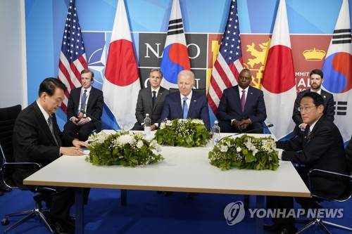 President Joe Biden, center, meets with South Korea's President Yoon Suk Yeol, left, and Japan's Prime Minister Fumio Kishida, right, during the NATO summit in Madrid, Wednesday, June 29, 2022. Seated behind Biden is, from left, White House national security adviser Jake Sullivan, Secretary of State Antony Blinken, Secretary of Defense Lloyd Austin, and National Security Council Director for the Korean Peninsula and Mongolia Adam Farrar. (AP Photo/Susan Walsh)