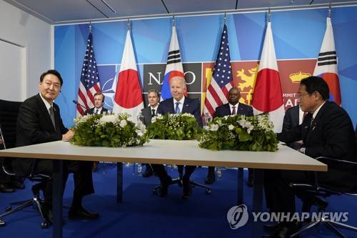 President Joe Biden, center, meets with South Korea's President Yoon Suk Yeol, left, and Japan's Prime Minister Fumio Kishida, right, during the NATO summit in Madrid, Wednesday, June 29, 2022. Seated behind Biden is, from left, White House national security adviser Jake Sullivan, Secretary of State Antony Blinken, Secretary of Defense Lloyd Austin, and National Security Council Director for the Korean Peninsula and Mongolia Adam Farrar. (AP Photo/Susan Walsh)