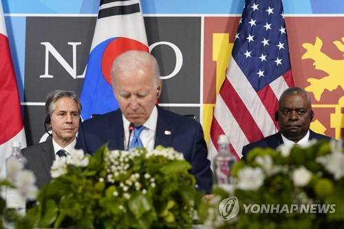 Secretary of State Antony Blinken, left, and Secretary of Defense Lloyd Austin, listens as President Joe Biden, center, meets with South Korea's President Yoon Suk Yeol and Japan's Prime Minister Fumio Kishida during the NATO summit in Madrid, Wednesday, June 29, 2022. (AP Photo/Susan Walsh)